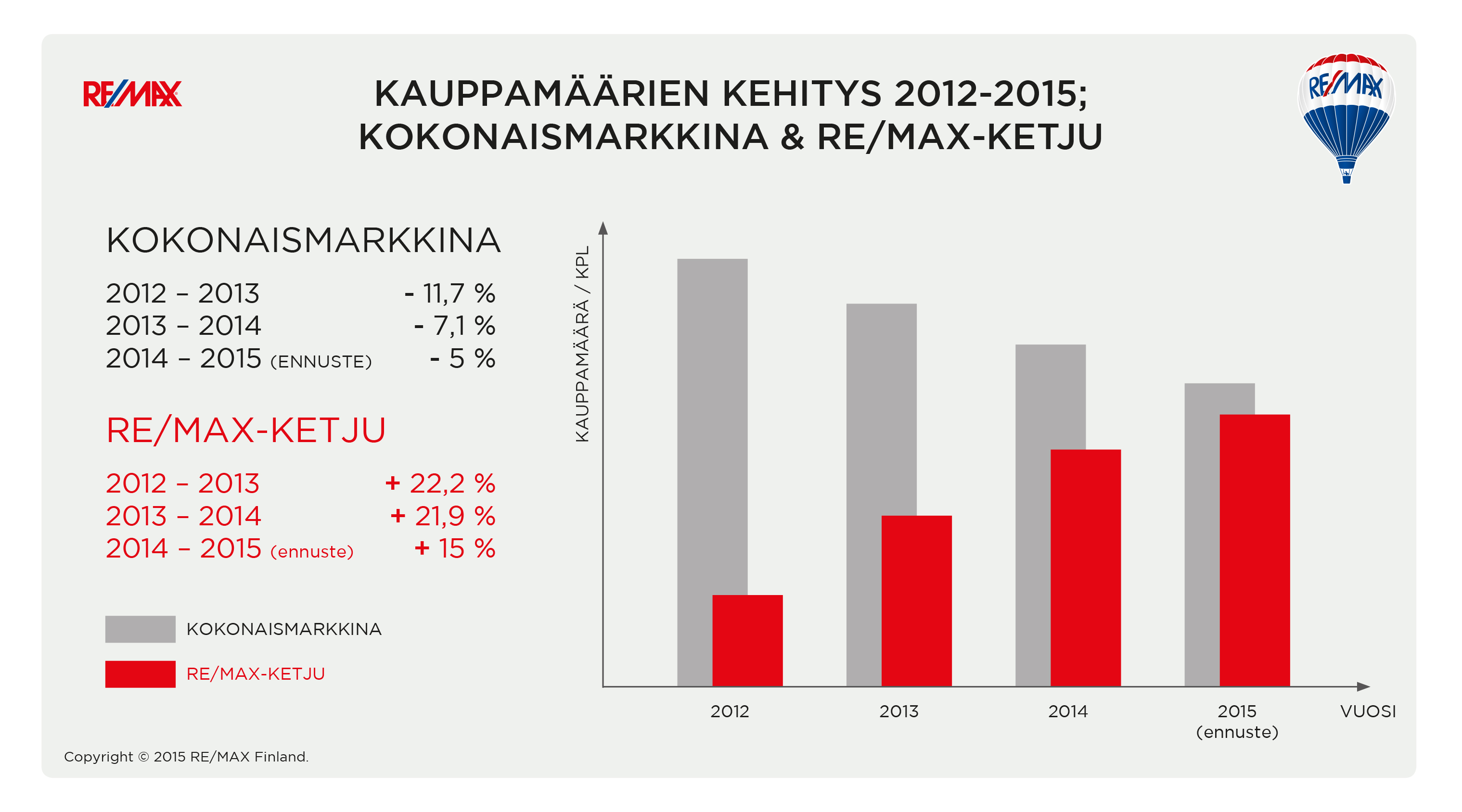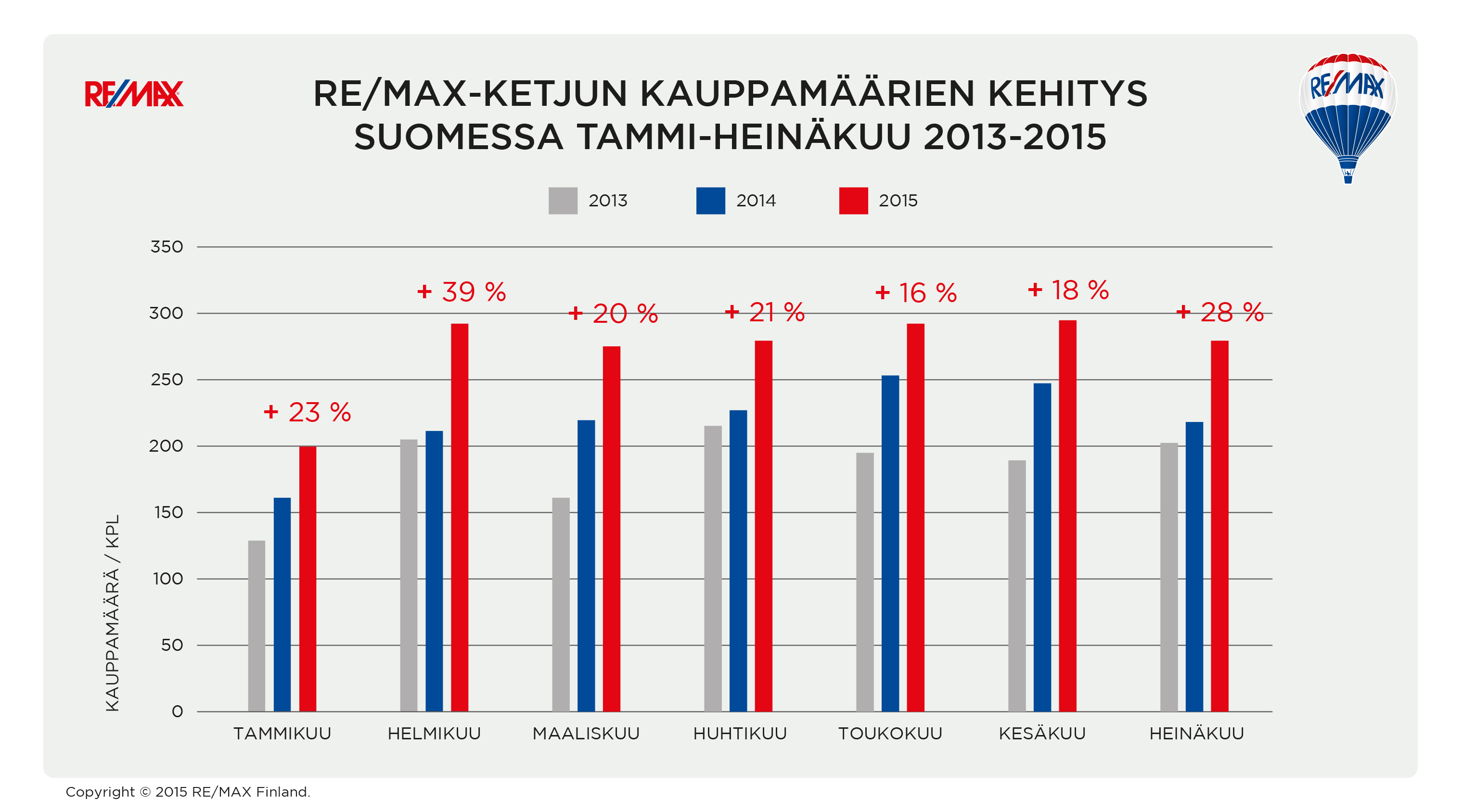 ”REMAXin kauppakehitys on ollut erittäin positiivista koko alkuvuoden. Olemme kasvattaneet kaikkien kauppojemme määrää koko alkuvuoden keskimäärin 24 %:lla joka kuukausi. Ketjumme välittäjät ovat osoittaneet poikkeuksellista aktiivisuutta koko vuoden, mikä selittää markkinasta poikkeavan tuloksen. Kesä on ollut meille vilkasta kauppa-aikaa ja sitä on varmasti auttaneet viileähköt säät”, kertoo REMAX-ketjun toimitusjohtaja Pasi Aalto.